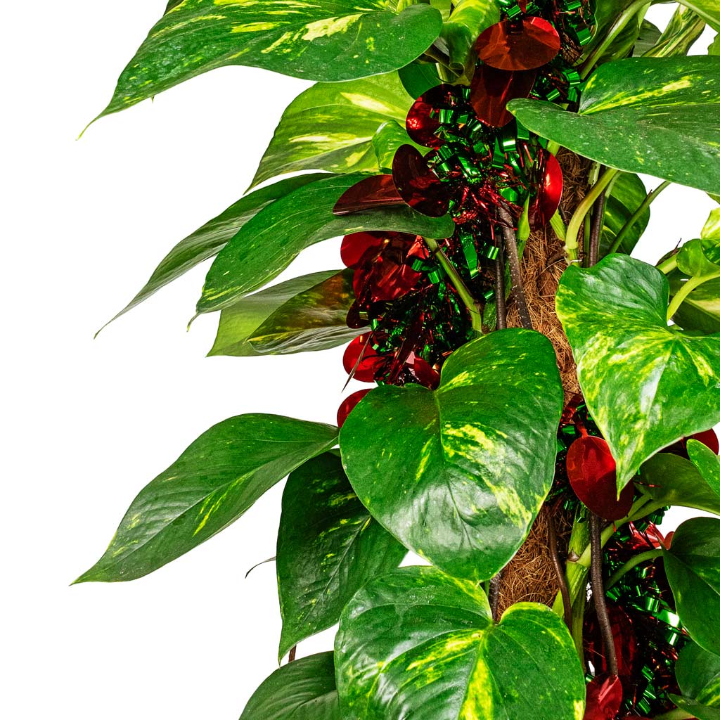 With a moss pole bringing height and support to the plant's overall look, wrap the pole with twists of tinsel to complement those climbing tendrils.