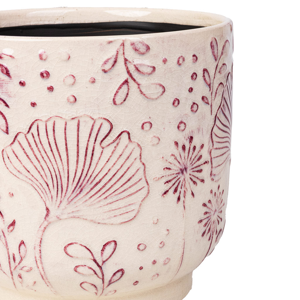Embossed and embellished; Emilia features a cream reactive glaze base with a textured, floral pink relief. Retro-vintage styling to subtly colour any corner.