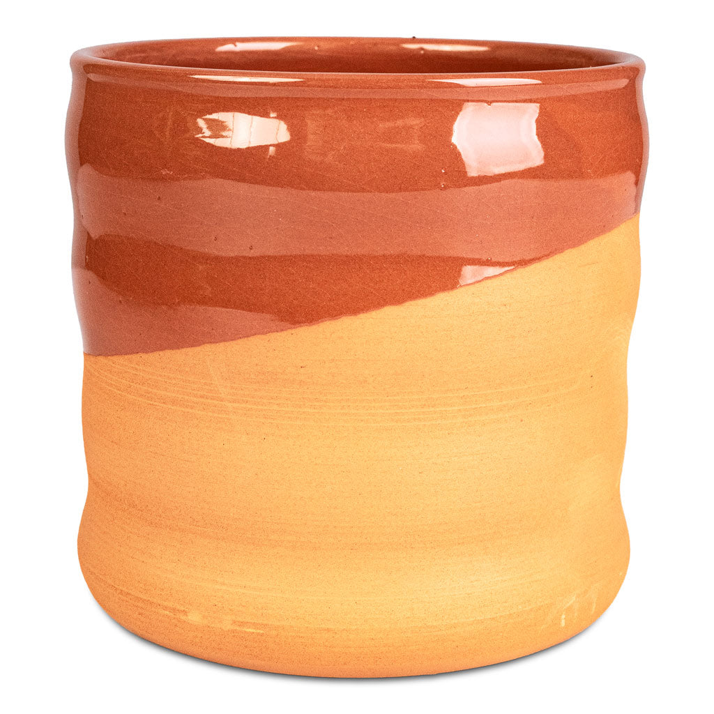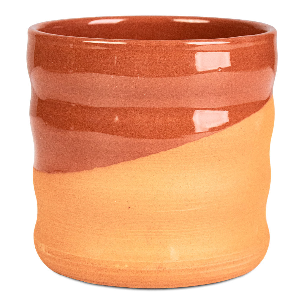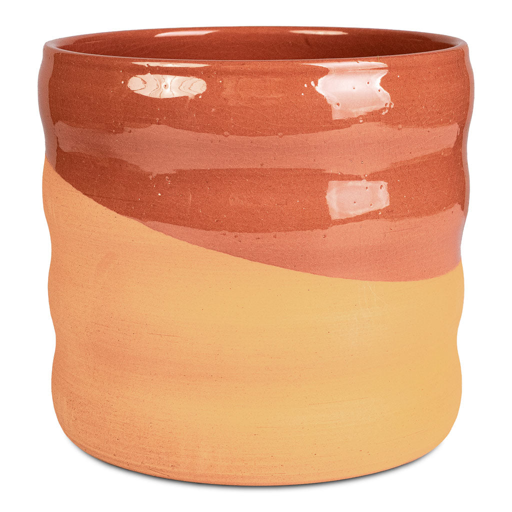 A tale of two textures: A rippled raw terracotta base with a sash of Saharan sunset glaze. Treat your greenery to this terracotta two-toned trinket. Desert decadence for warm, rustic displays.