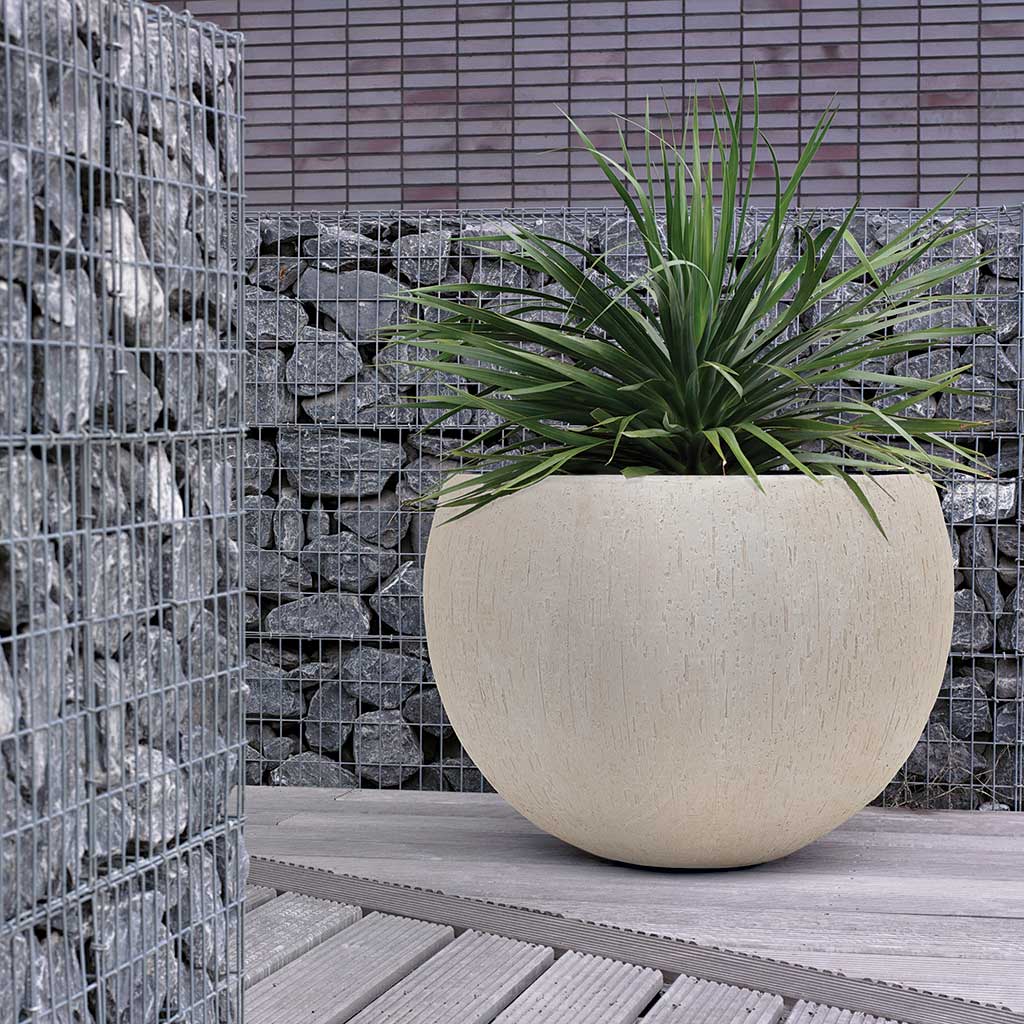 Made from pigmented sandstone and resin for strength and lightweight durability for greenscapes both inside and outside.